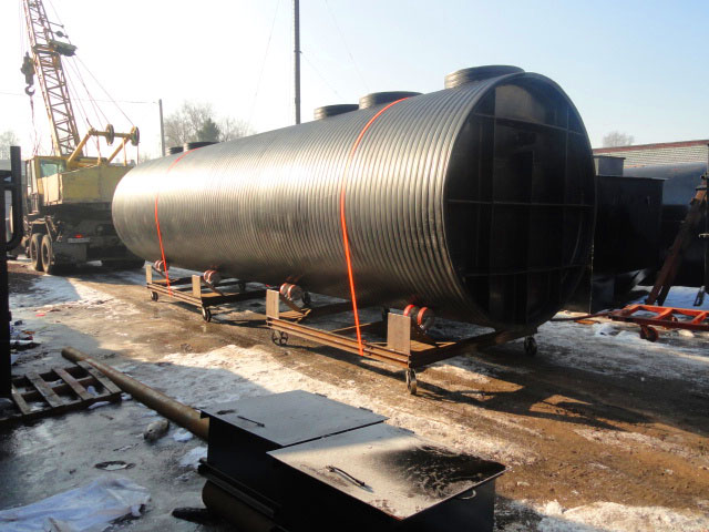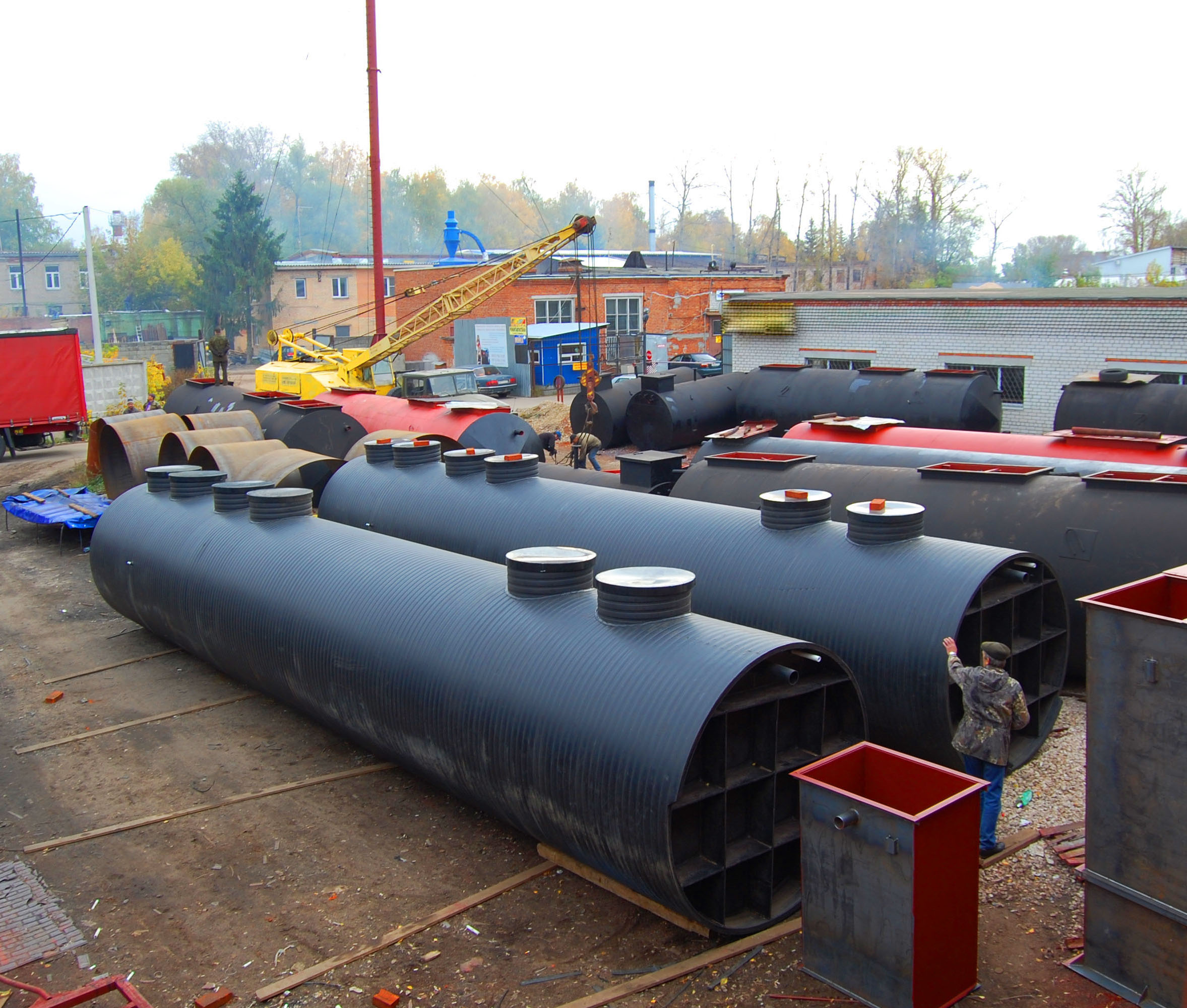 Представляет собой резервуары с колодцами обслуживания и трубной обвязкой. Изготавливается из низколегированной стали с многослойным антикоррозийным покрытием.  Возможен вариант исполнения корпуса из спиральновитой трубы из полиэтилена низкого давления (ПНД) или ударопрочного полипропилена.
