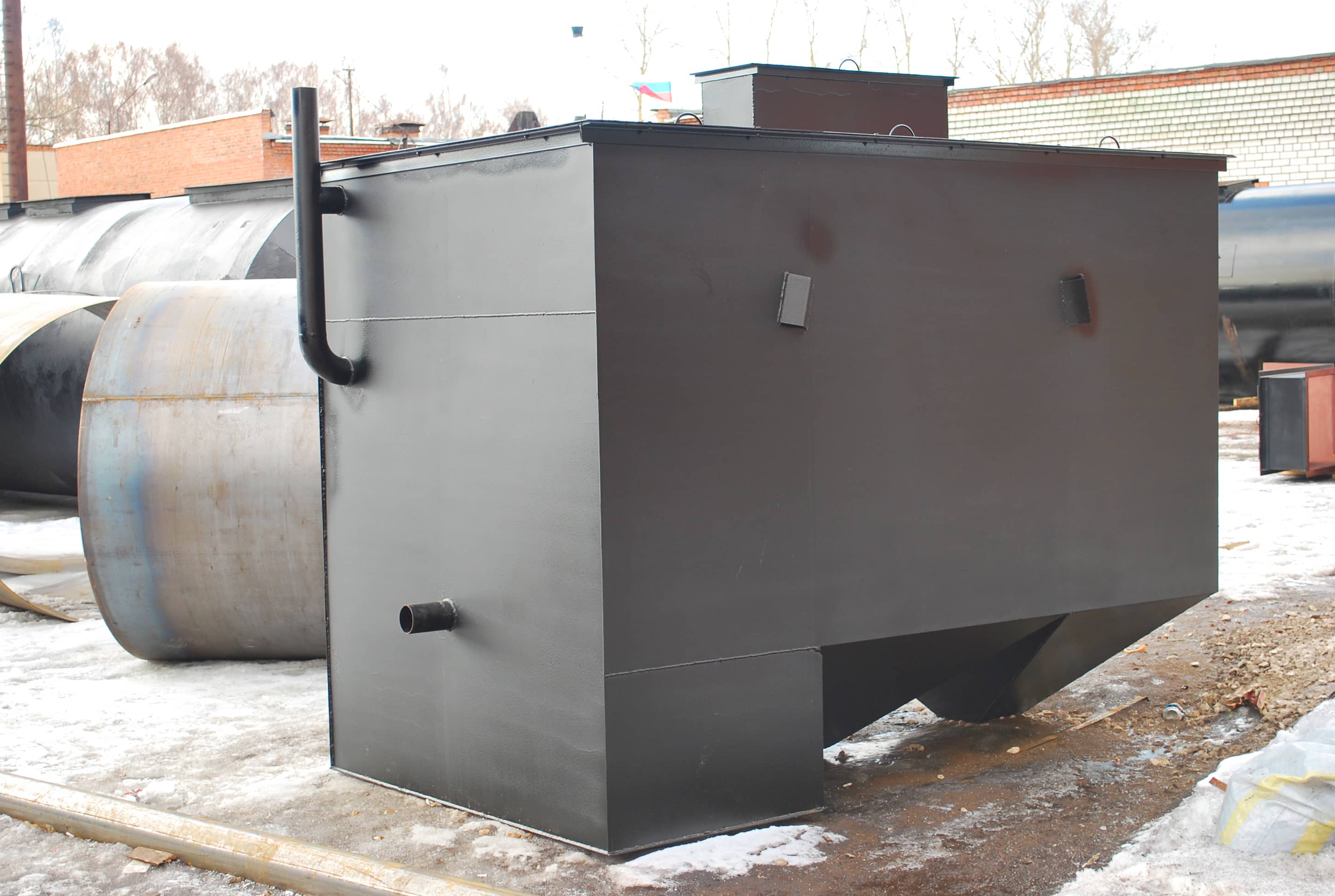 Установка изготавливается из легированной листовой стали толщиной 4 мм, защищенной антикоррозийным покрытием из материалов, специально предназначенных для изоляции конструкций очистных сооружений. Для доступа в отсек очистного сооружения предусмотрен технический колодец.